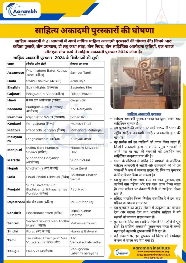 साहित्य अकादमी पुरस्कार -2024 के विजेताओं की सूची